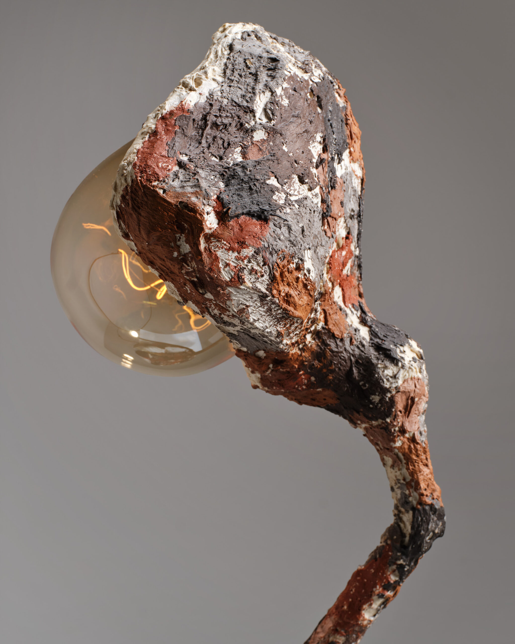 Gesso e metallo definiscono la struttura, mentre il cuoio ammorbidisce il disegno, rendendolo dinamico. Babbasune è disponibile in due misure, e si distingue per l’equilibrio tra rigore costruttivo e leggerezza espressiva. Più che una semplice fonte luminosa, si configura come un microdispositivo relazionale, in grado di attivare un uso partecipato e consapevole.